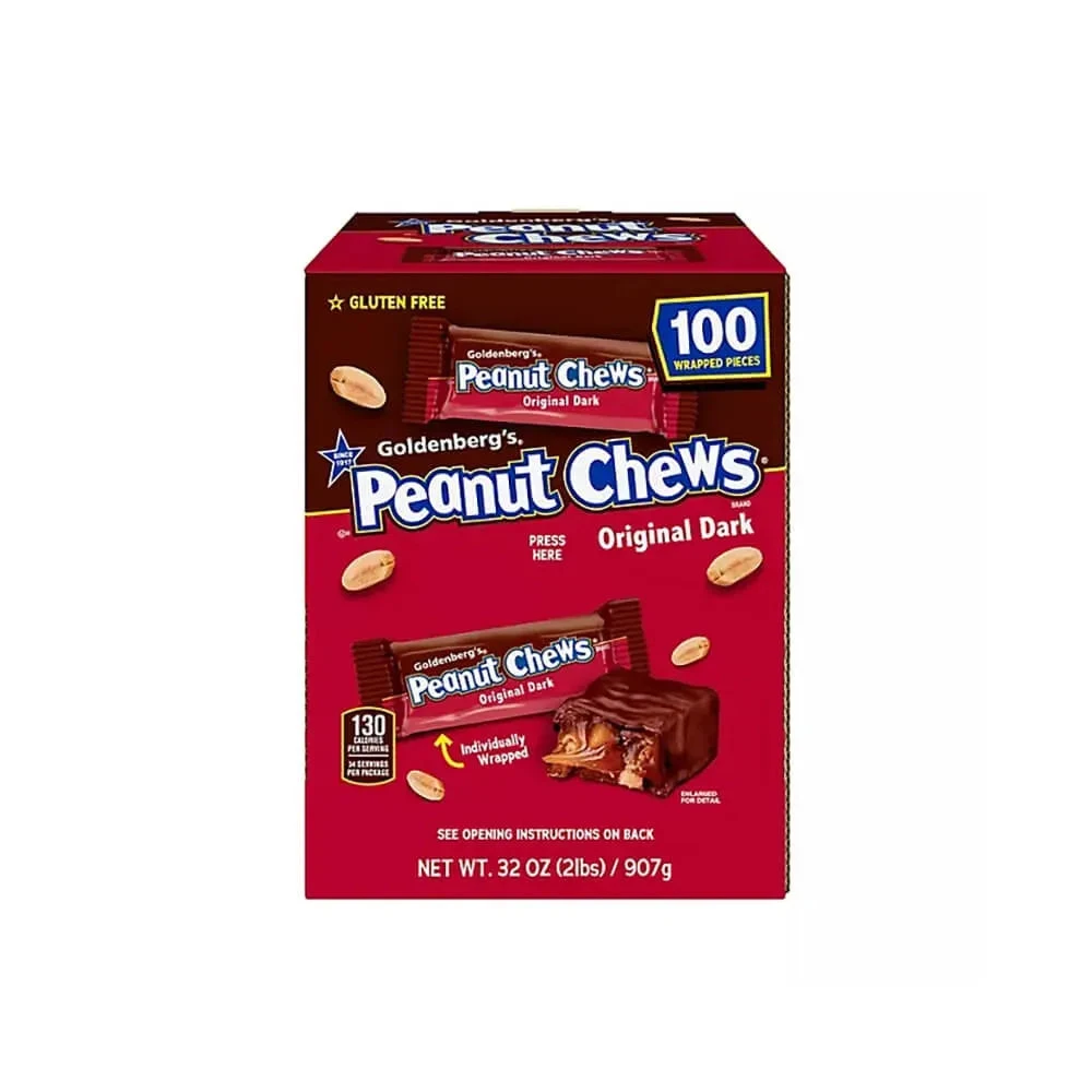 Box contains 100 Goldenberg’s Peanut Chews Original Dark Mini Candy Bars.Â