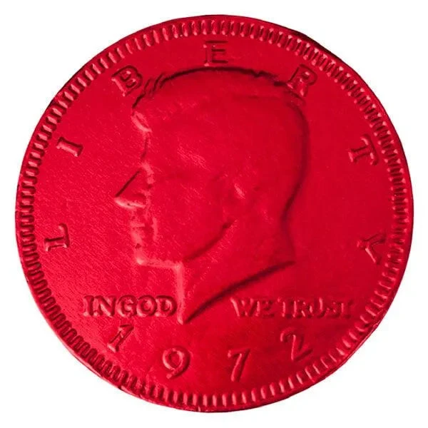 Aptly named for the Bullion Depository vault of the United States Department of the Treasury, these delicious milk chocolate coins are wrapped in red metallic foils embossed with images found on a real US half dollar coin.